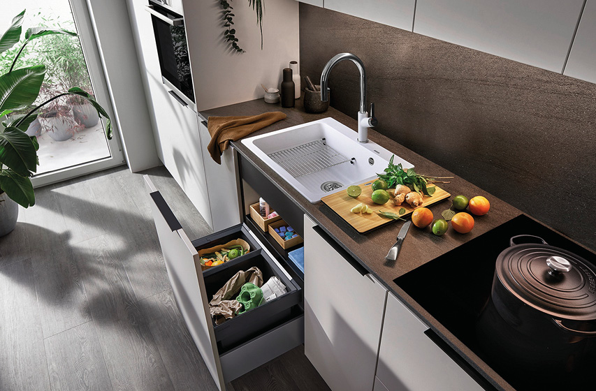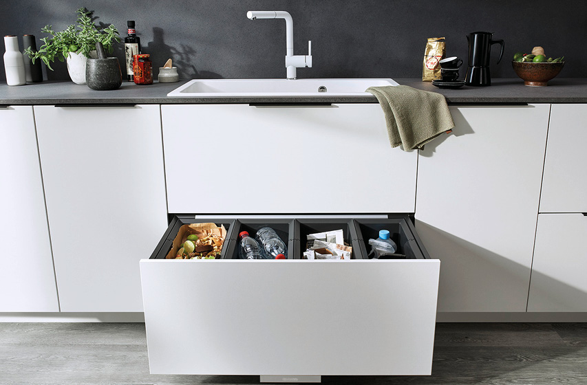 Um den Arbeitsplatz rund um den Wasserhahn sinnvoll zu ergänzen, bietet die BLANCO Unit ein Abfallsystem im Unterschrank, das auf optimale Mülltrennung ausgelegt ist.
