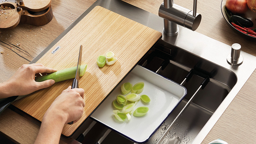 So können Sie Gemüse direkt auf dem Schneidebrett vorbereiten und Schalen, Kerne oder andere Reste seitlich in eine Multifunktionsschale schieben. Alles passiert direkt rund um die Spüle, ohne weite Wege.