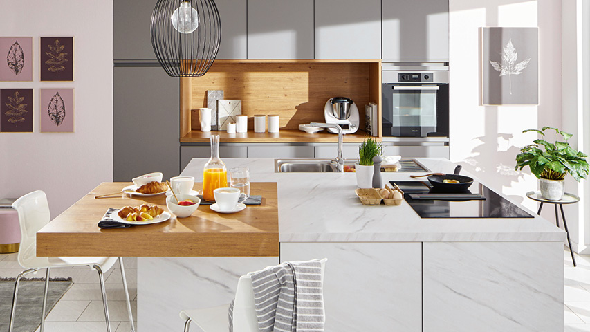 Der größte Vorteil von Laminat-Arbeitsplatten ist der günstige Preis. Außerdem lässt sich nahezu jede Optik realisieren – Beton, Holz, Marmor oder kräftige Farben. Die Platten sind pflegeleicht und sehr flexibel hinsichtlich Größe, Form und Plattendicke.
