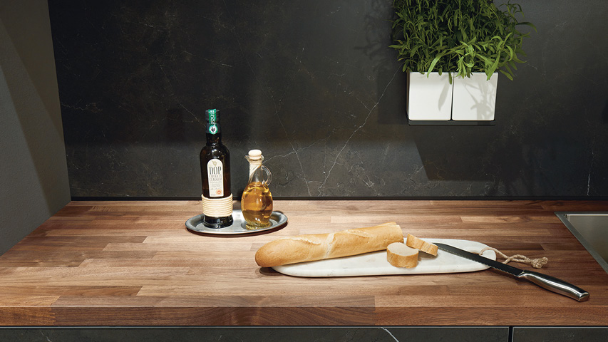 Massivholz-Arbeitsplatten leben von ihrer natürlichen Ausstrahlung, der warmen Haptik und den ökologischen Vorteilen. Preislich bewegen sie sich im mittleren bis höheren Segment. Grundsätzlich gilt: Je härter das Holz, desto robuster und langlebiger ist die Küchenarbeitsplatte.